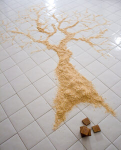Instalación que busca visualizar los procesos industriales que nos han llevado a romper la relación entre el elemento natural del que se extrae el material y el objeto industrial final, así se presenta la sombra de un árbol realizada en aserrín y el duramen de un tronco encontrado en un polín. La pieza al pertenecer …